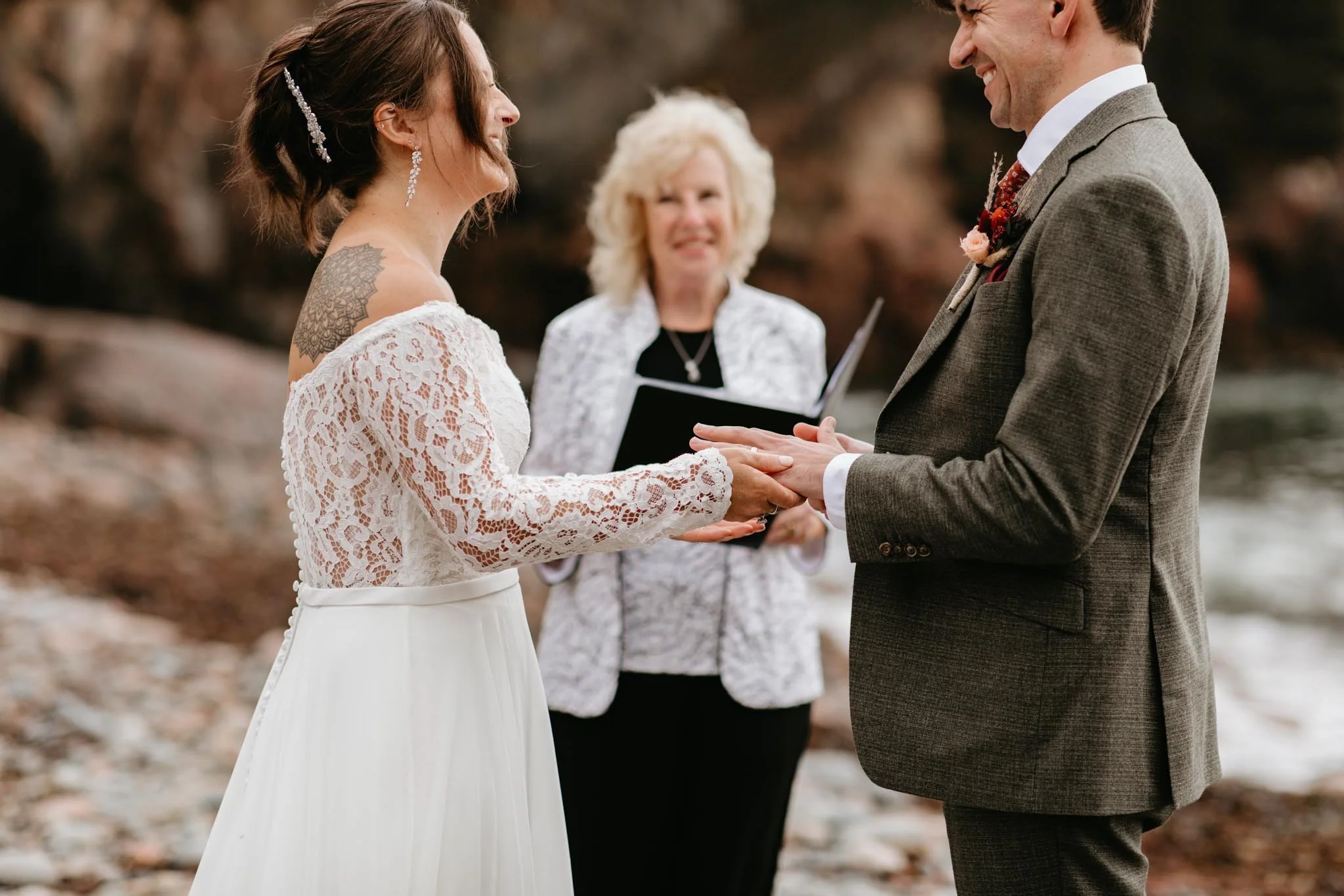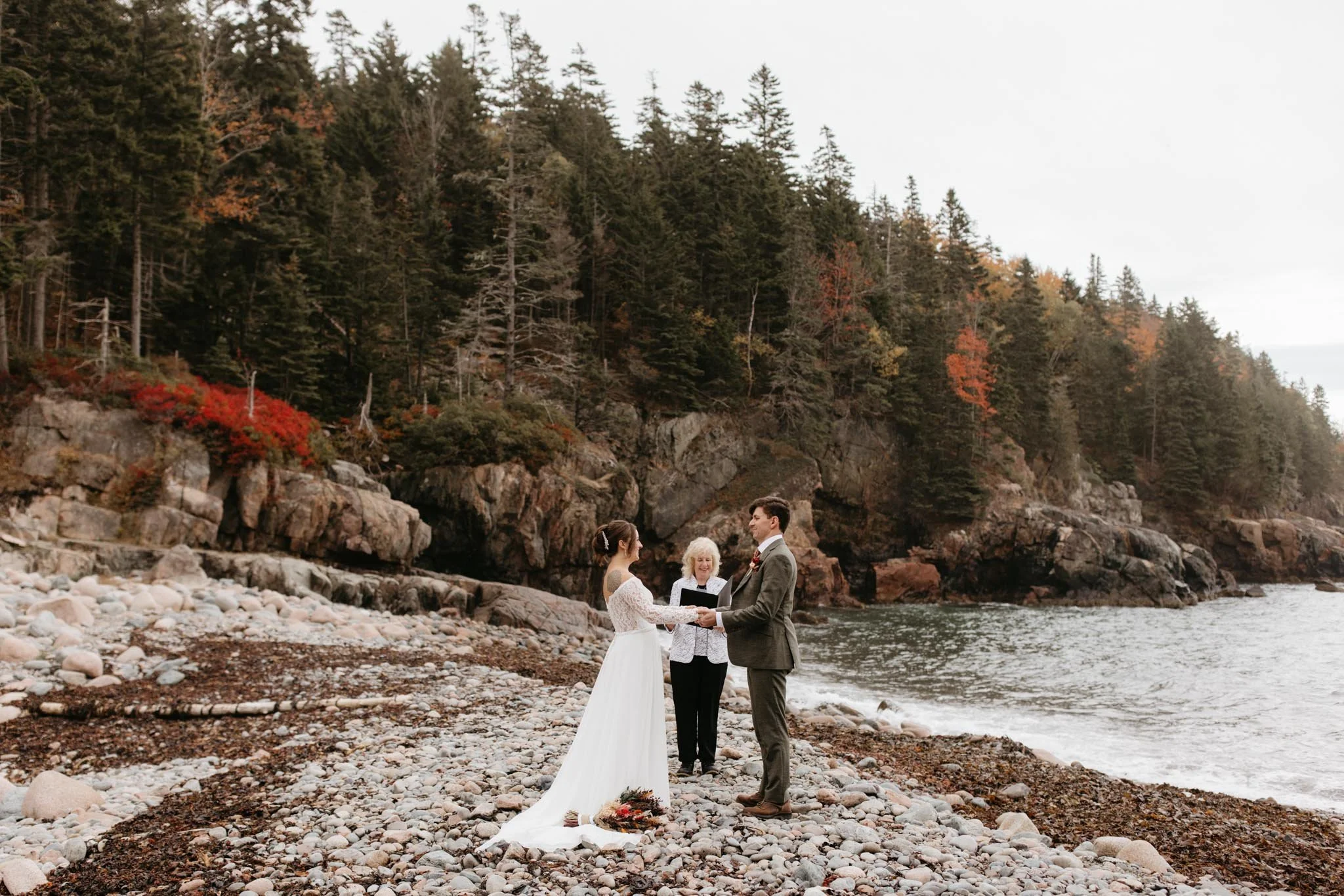Next, we met their officiant at their ceremony location! Surrounded by Acadia’s dramatic landscape, they shared vows, popped champagne, and soaked in the misty moody scenery and it was absolutely perfect!